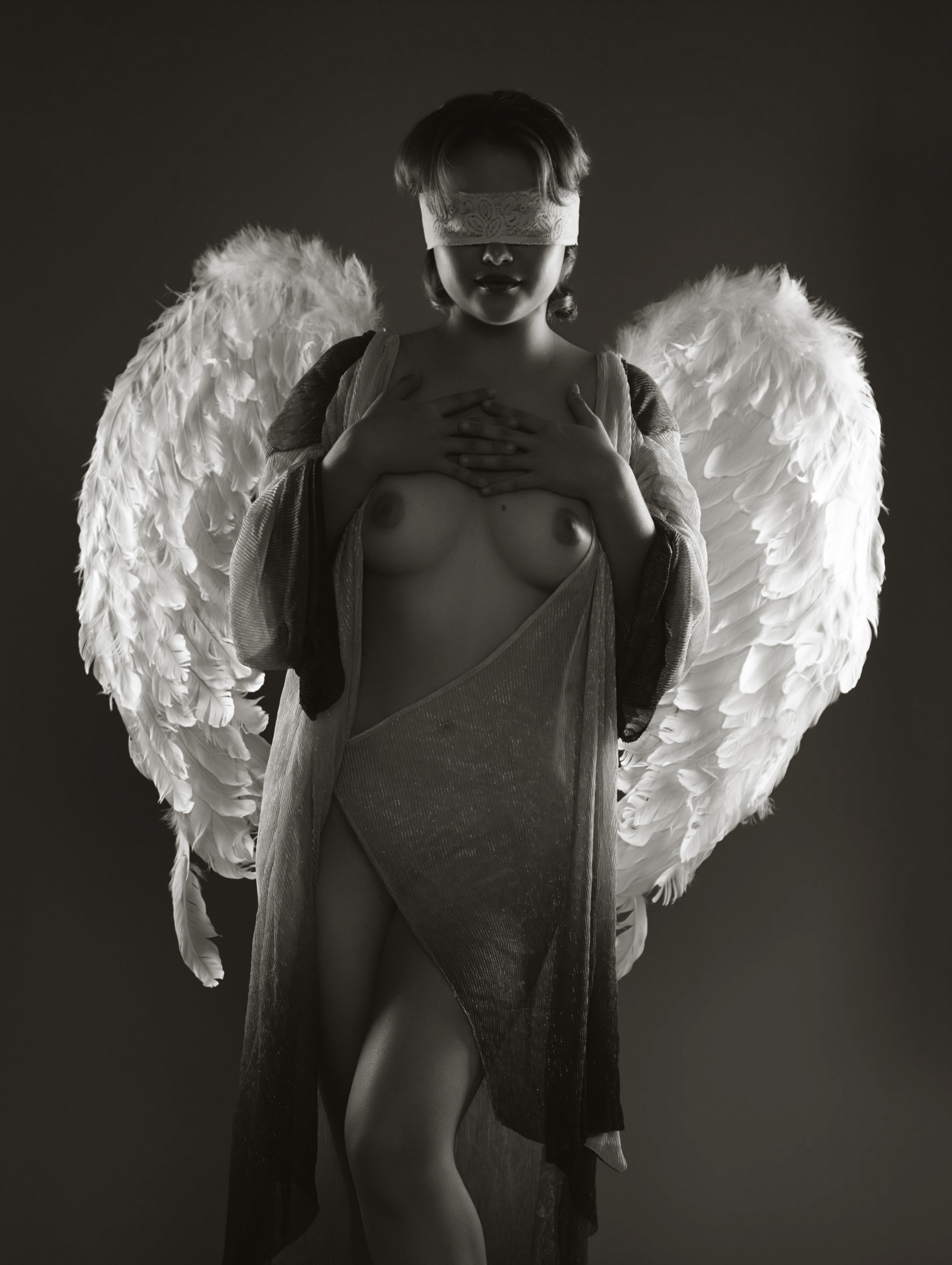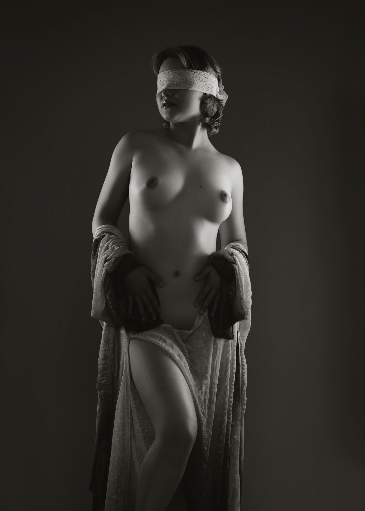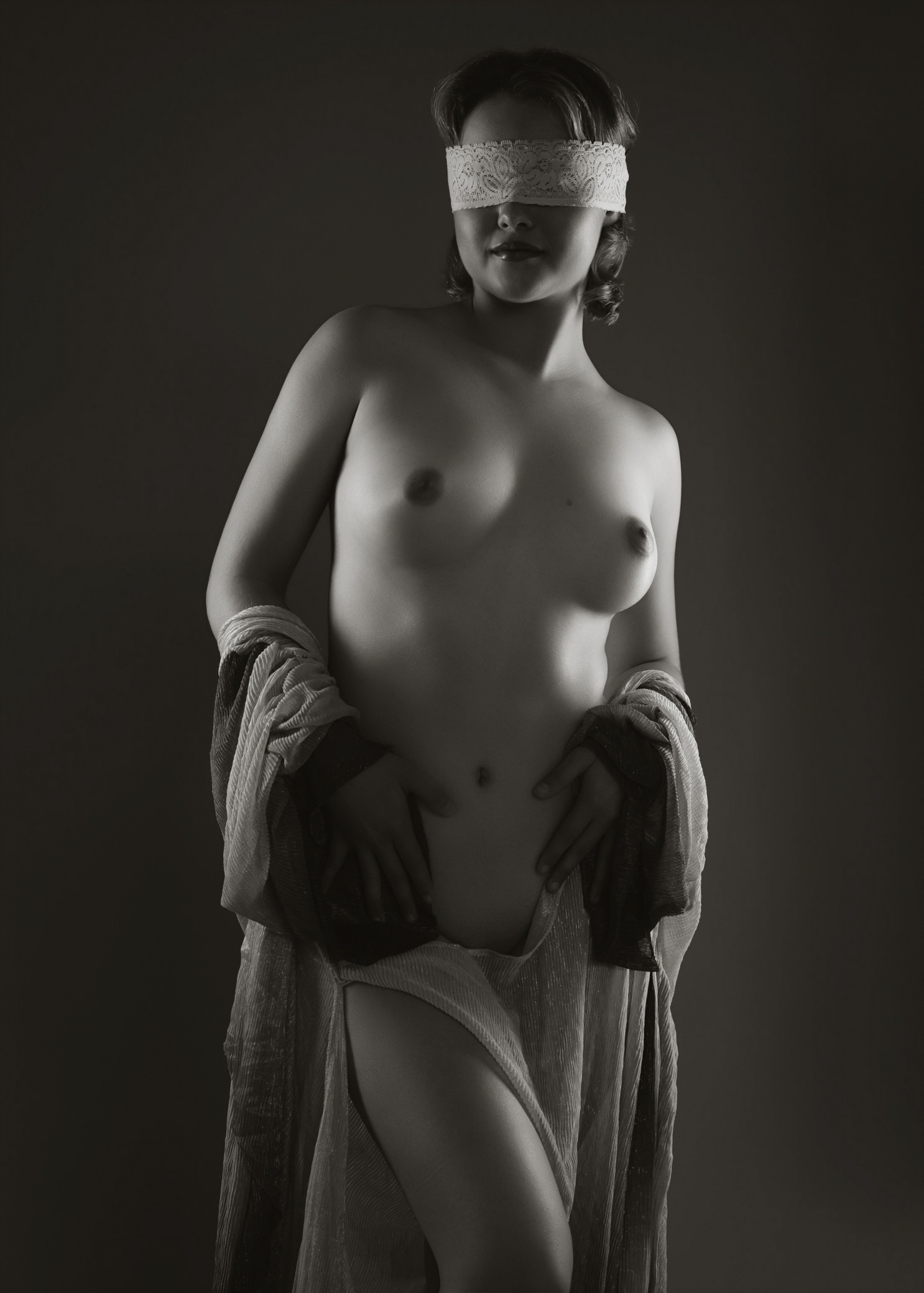 La venda en sus ojos no es fragilidad: es elección. Es confianza. Es la entrega consciente a lo inevitable, a ese destino que no se controla, pero sí se honra. Al no mirar, se escucha; al no buscar certezas, se encuentra a sí misma. Su cuerpo se vuelve templo y símbolo: una escultura viva donde cada curva habla de coraje, calma y dignidad.