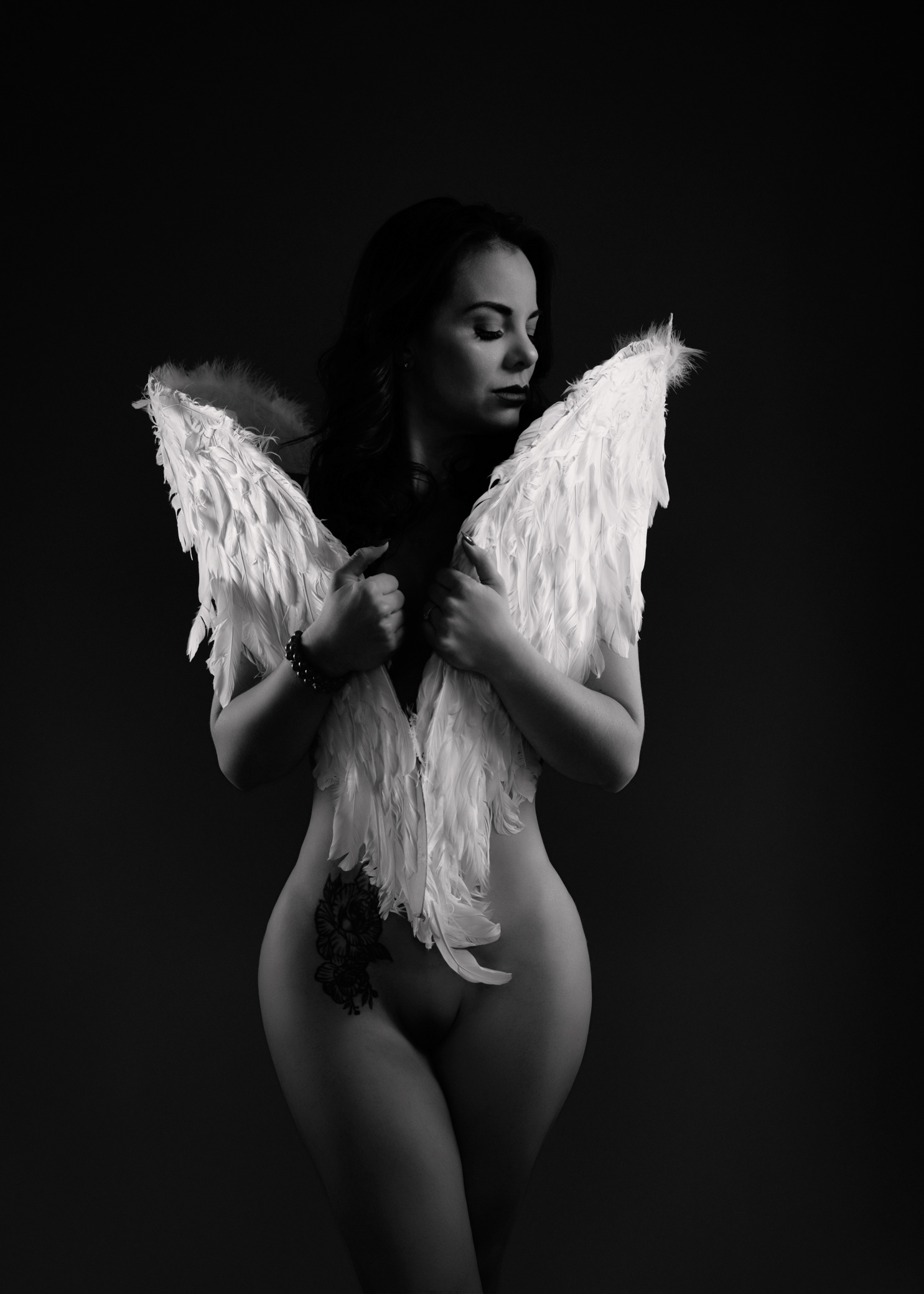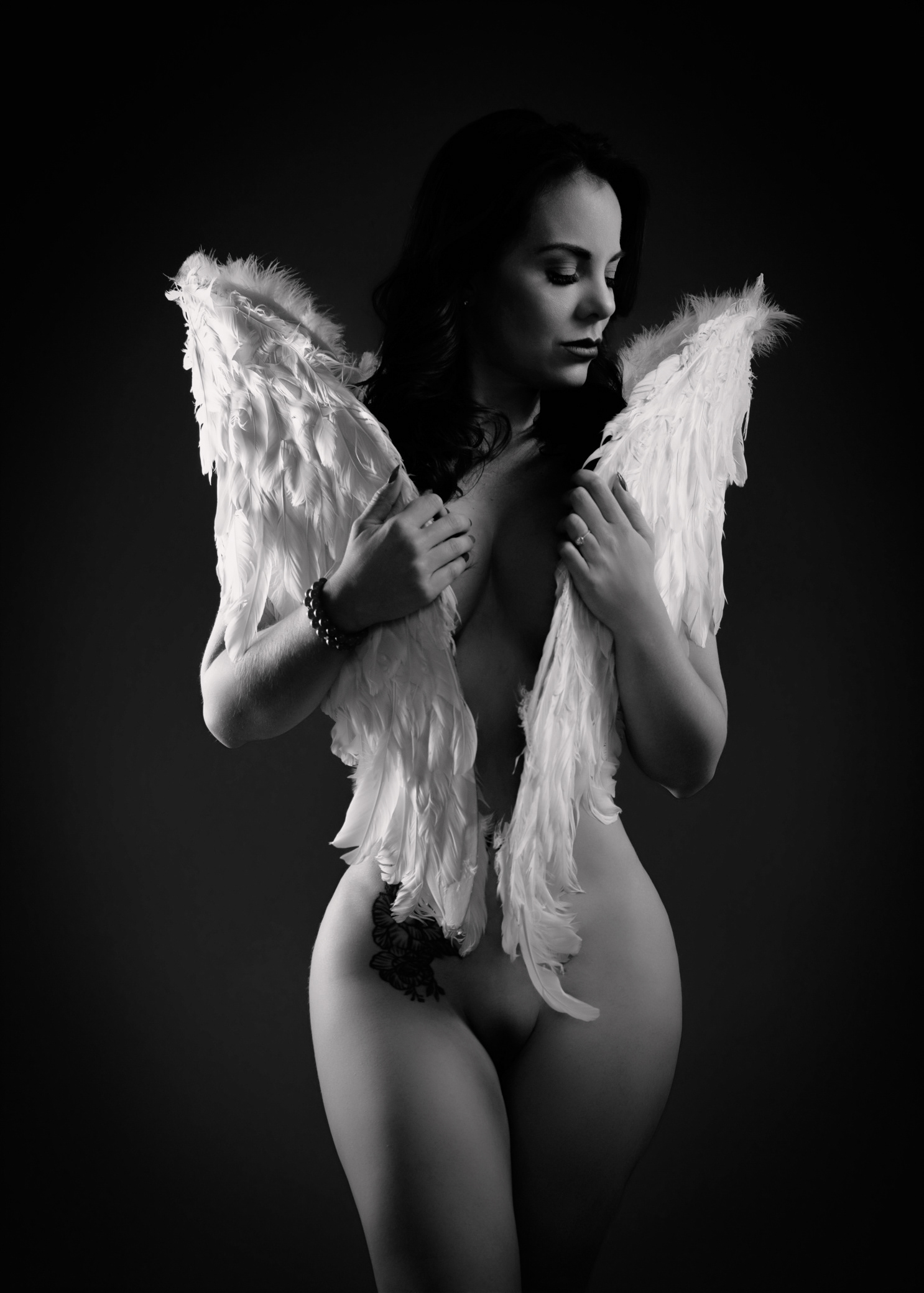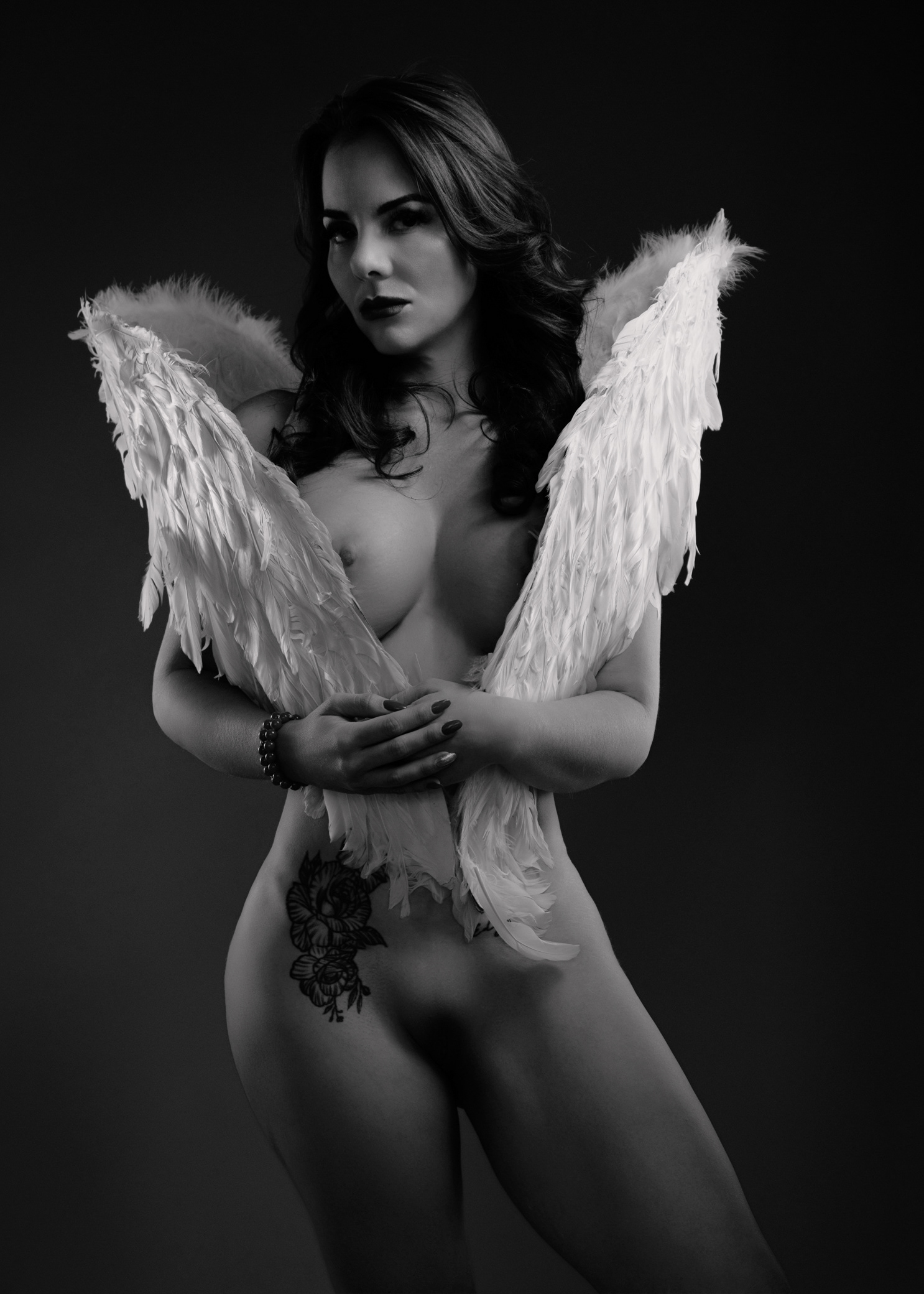 llegó con el corazón en silencio y una historia guardada bajo la piel: miedos aprendidos, miradas ajenas, frases que alguna vez pesaron. Pero esa tarde, en un espacio discreto y seguro, decidió envolver sus temores en alas divinas —no para esconderse, sino para proteger lo más sagrado: su verdad. La luz la encontró con suavidad, como si supiera dónde tocar sin herir. Cada pose fue un susurro de valentía; cada respiración, un “sí” a su propio cuerpo. No vino a complacer a la crítica social: vino a recuperar su nombre, su ritmo, su deseo de existir sin permiso. Poco a poco, lo que antes era pudor se volvió presencia. Lo que antes era duda se transformó en mirada firme. Y en esa danza íntima entre sombra y luz, ella se descubrió hermosa de una manera nueva: no por encajar, sino por atreverse. Valiente, capaz, inquebrantable. Cuando por fin bajó sus alas —solo un poco— entendió algo simple y poderoso: su cuerpo no era un juicio, era un templo.