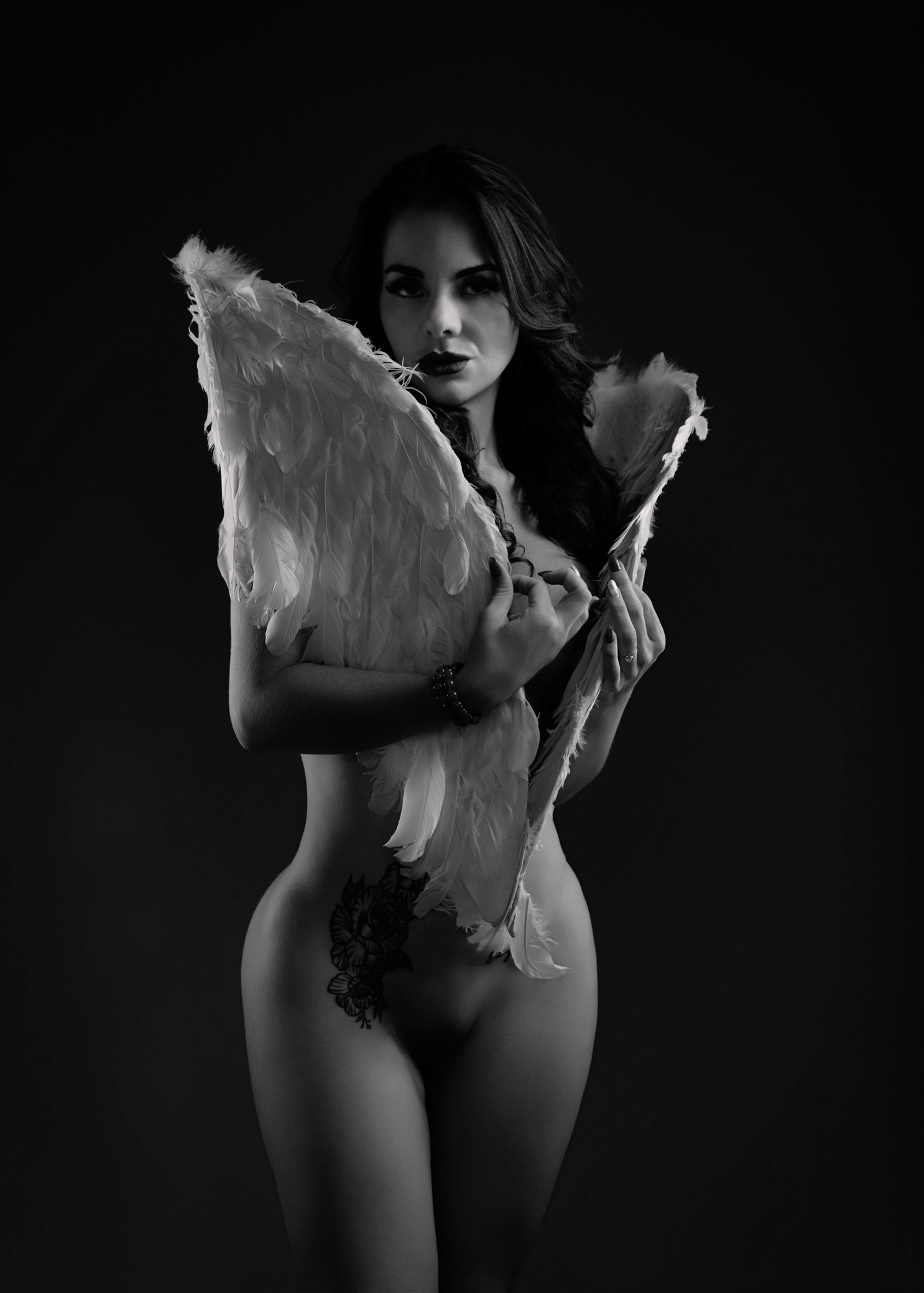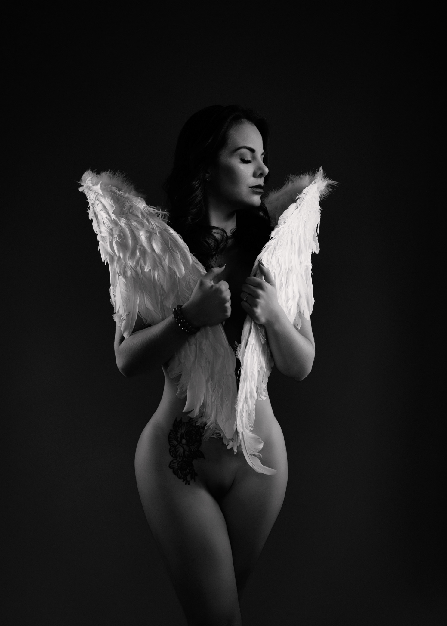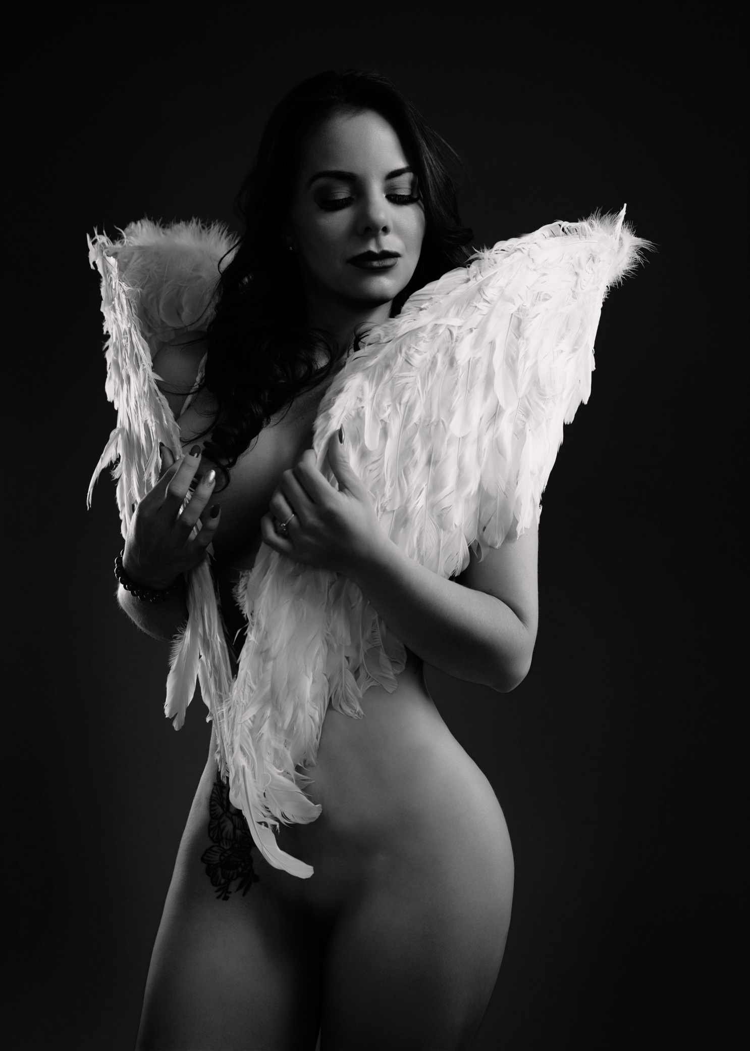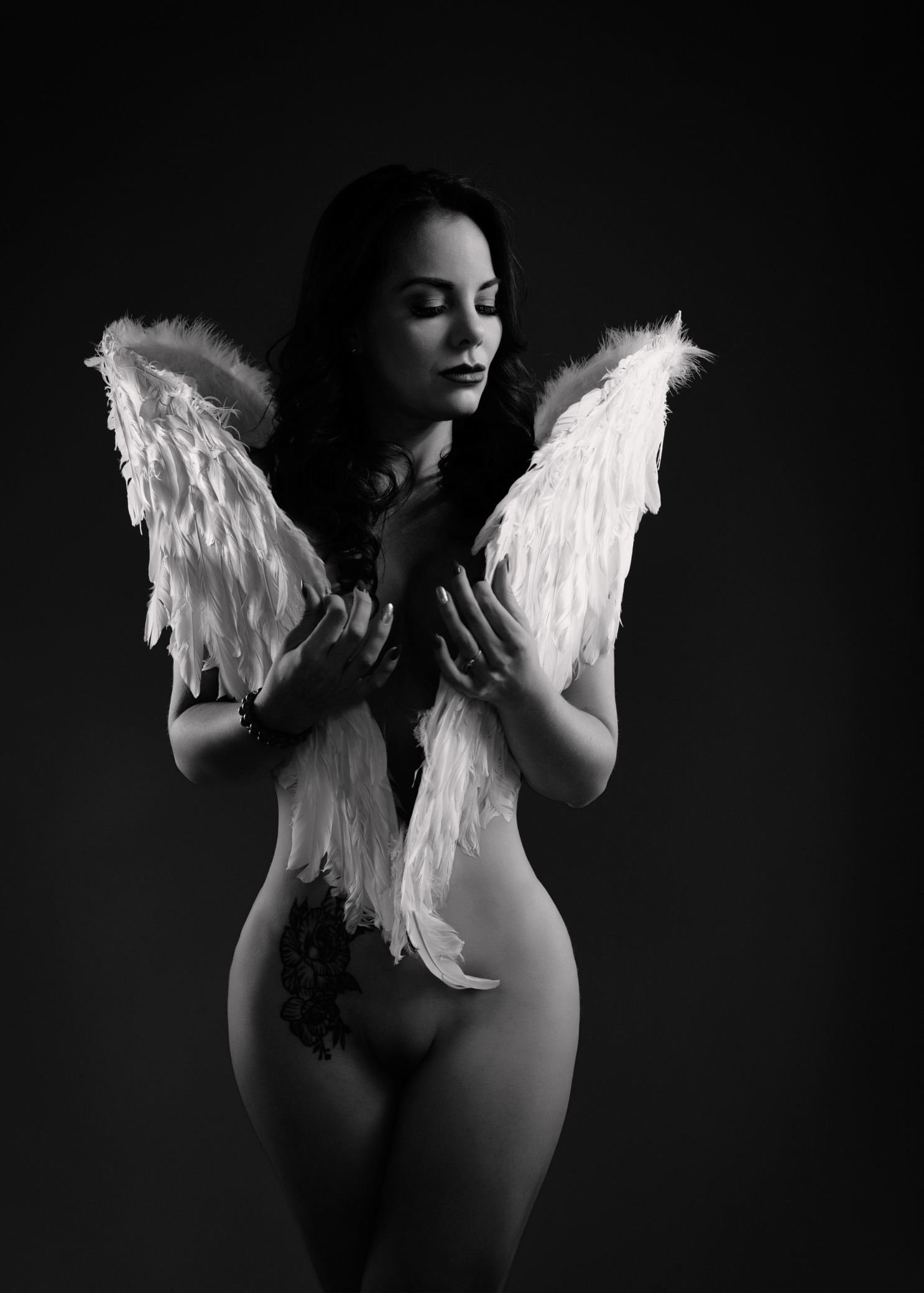 llegó con el corazón en silencio y una historia guardada bajo la piel: miedos aprendidos, miradas ajenas, frases que alguna vez pesaron. Pero esa tarde, en un espacio discreto y seguro, decidió envolver sus temores en alas divinas —no para esconderse, sino para proteger lo más sagrado: su verdad. La luz la encontró con suavidad, como si supiera dónde tocar sin herir. Cada pose fue un susurro de valentía; cada respiración, un “sí” a su propio cuerpo. No vino a complacer a la crítica social: vino a recuperar su nombre, su ritmo, su deseo de existir sin permiso. Poco a poco, lo que antes era pudor se volvió presencia. Lo que antes era duda se transformó en mirada firme. Y en esa danza íntima entre sombra y luz, ella se descubrió hermosa de una manera nueva: no por encajar, sino por atreverse. Valiente, capaz, inquebrantable. Cuando por fin bajó sus alas —solo un poco— entendió algo simple y poderoso: su cuerpo no era un juicio, era un templo.