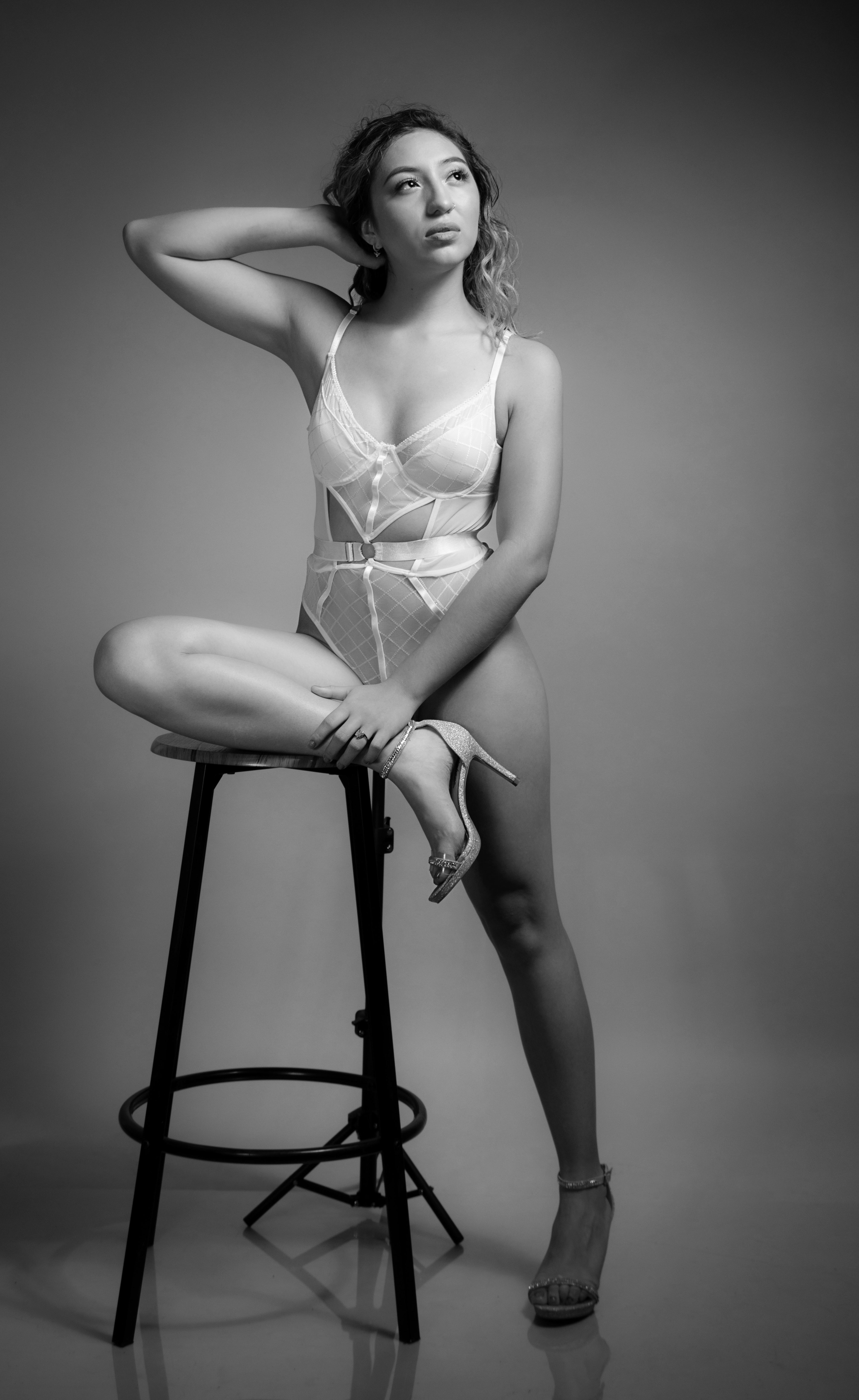 En un escenario íntimo en blanco y negro, una hermosa joven se destaca en una sesión de boudoir. Con elegancia y delicadeza explora una nueva experiencia.